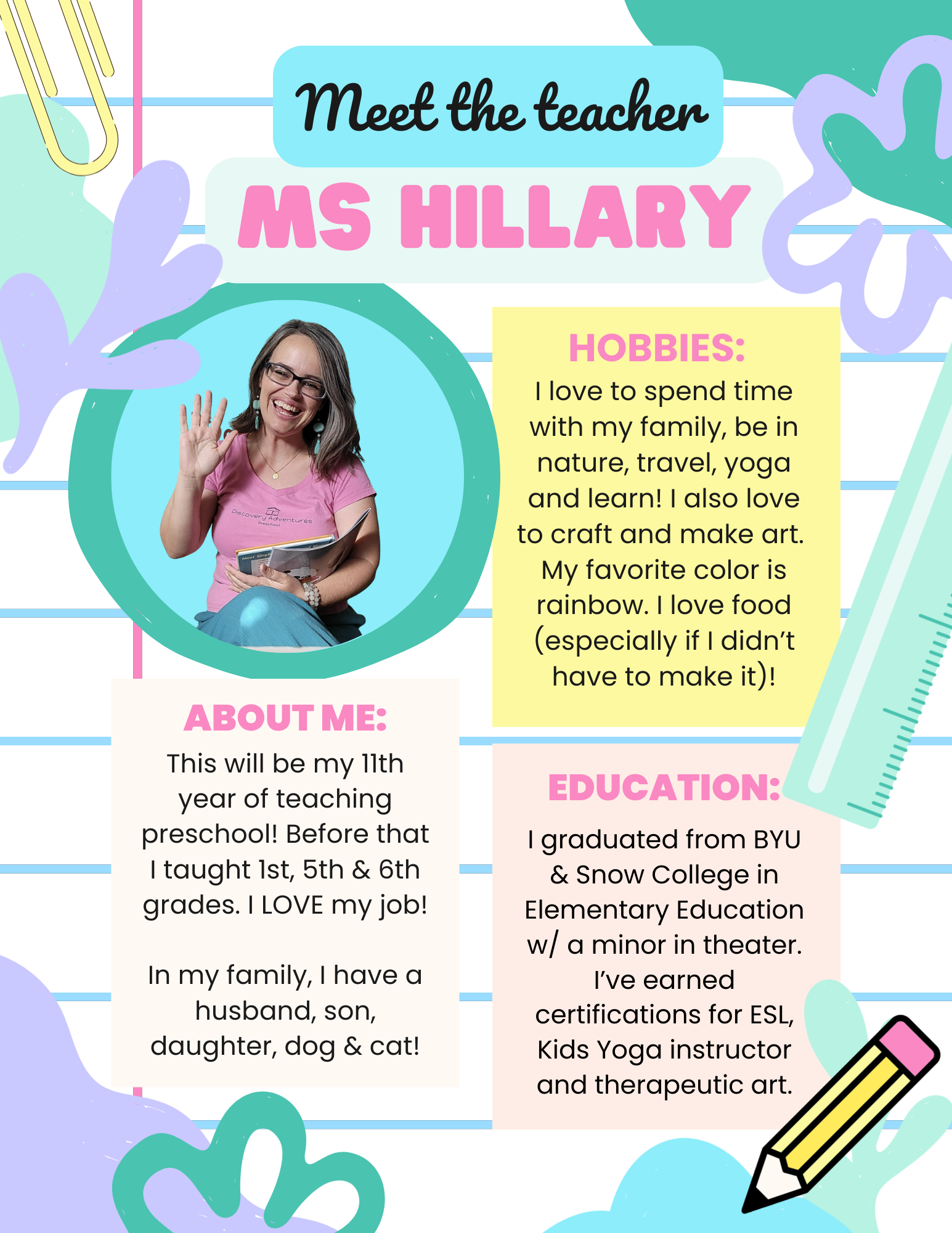 Hi friends! I’m Ms. Hillary, and I’m the owner and lead teacher at Discovery Adventures Preschool this year! This will be my 11th year teaching preschool, and before that, I taught elementary in 1st, 5th, and 6th grades. Teaching has always been my passion and dream and I’ve loved every age and grade. But there’s something truly magical about these preschool years—they’re filled with curiosity, creativity, and so many “lightbulb” moments.